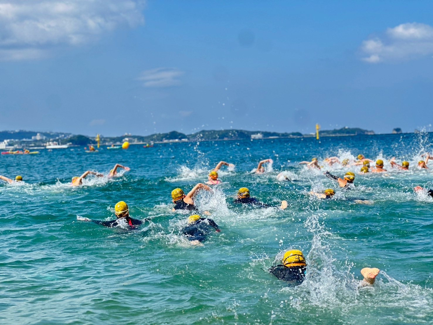 遠泳大会「南紀田辺・扇ヶ浜オープンウォータースイミング」は、(公財)日本水泳連盟の認定大会として開催しており、健康増進・スポーツ振興への寄与、交流人口の増加と扇ヶ浜海水浴場の利用促進・田辺市のPRを主な目的として毎年6月に開催しています。オープンウォータースイミングとは、自然の海や川、湖などで行われる水泳競技で、夏期オリンピックの正式種目にもなっている注目のスポーツです。